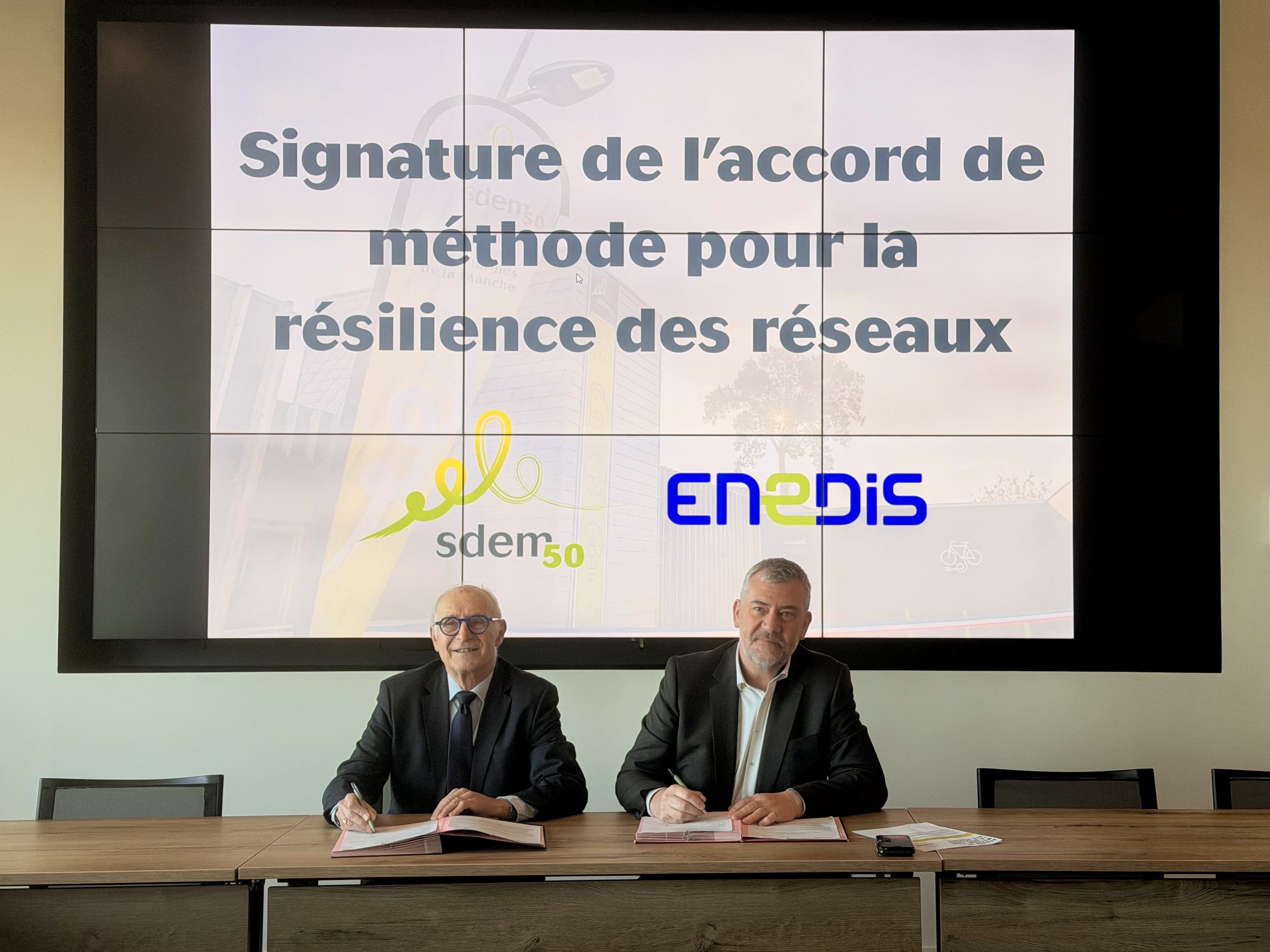 Jean-Claude Braud, président du SDEM50, et Olivier Lagnel, directeur régional d’Enedis en Normandie, ont signé un accord de méthode visant à améliorer durablement la robustesse des infrastructures électriques sur le territoire de la Manche.